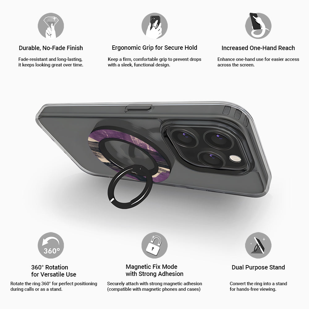 Add artistic flair with this magnetic phone ring holder in a purple abstract design. Secure grip and stand functionality for everyday use.