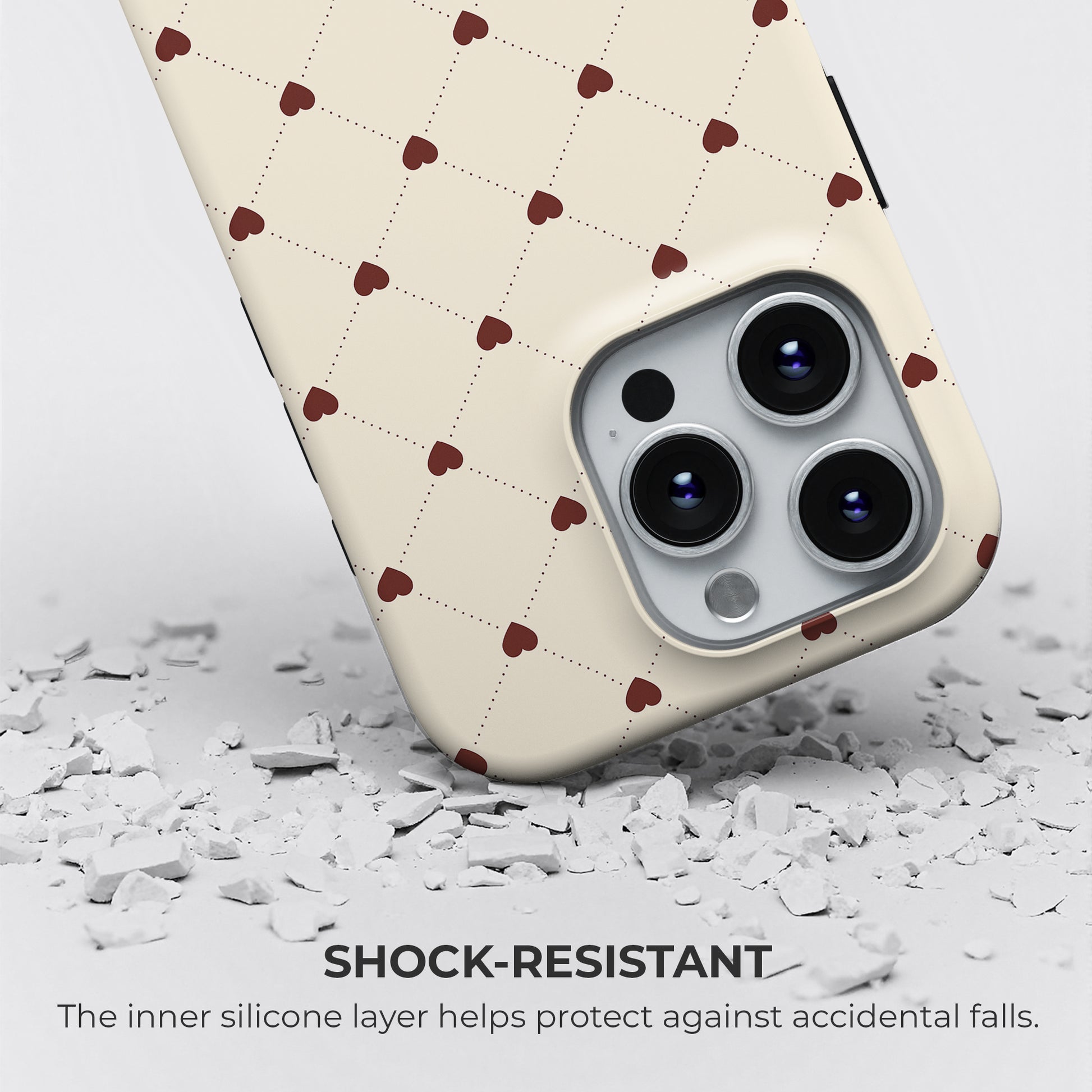 Charming iPhone case with a minimalist beige background and red heart grid design. Perfect gift for romantics and style lovers alike.
