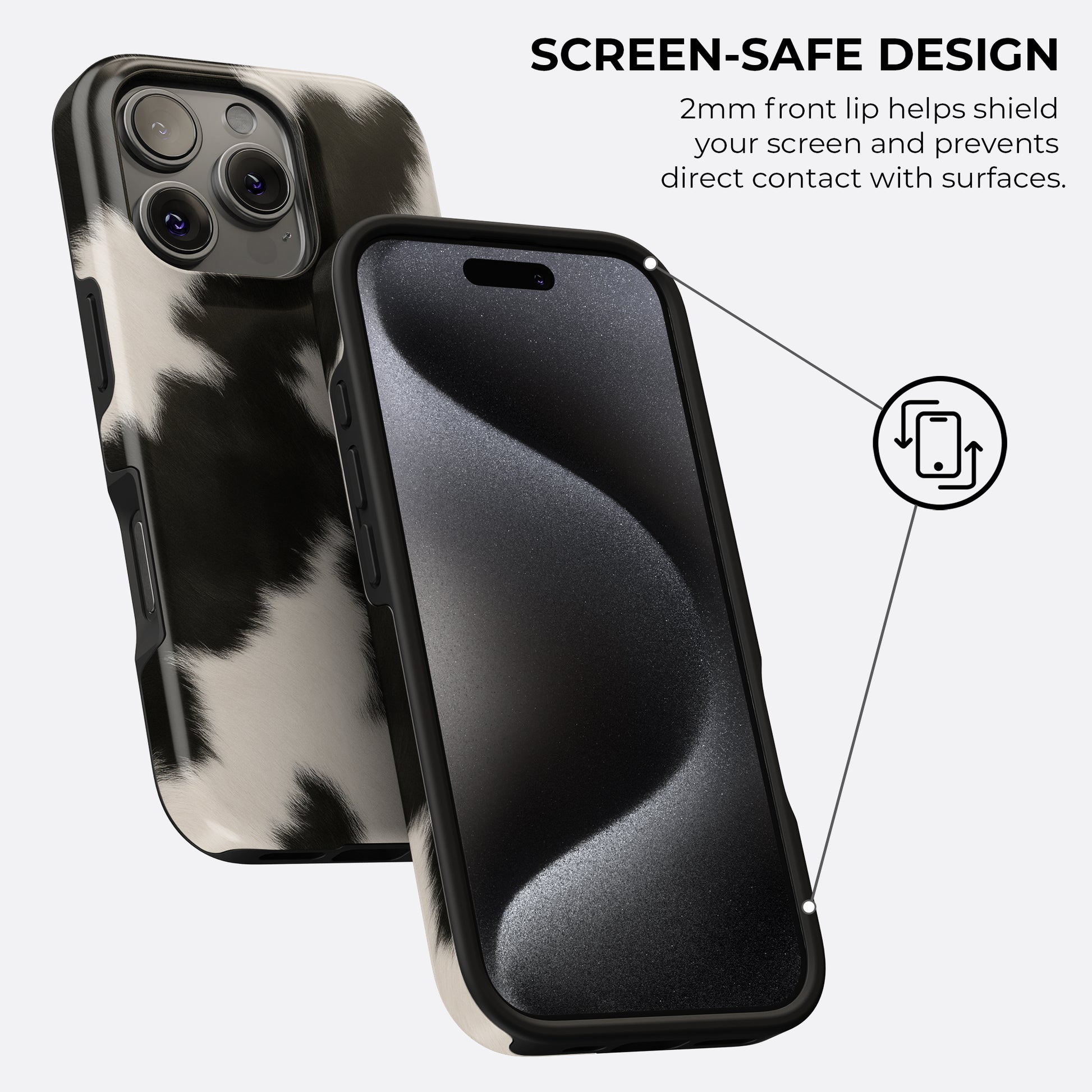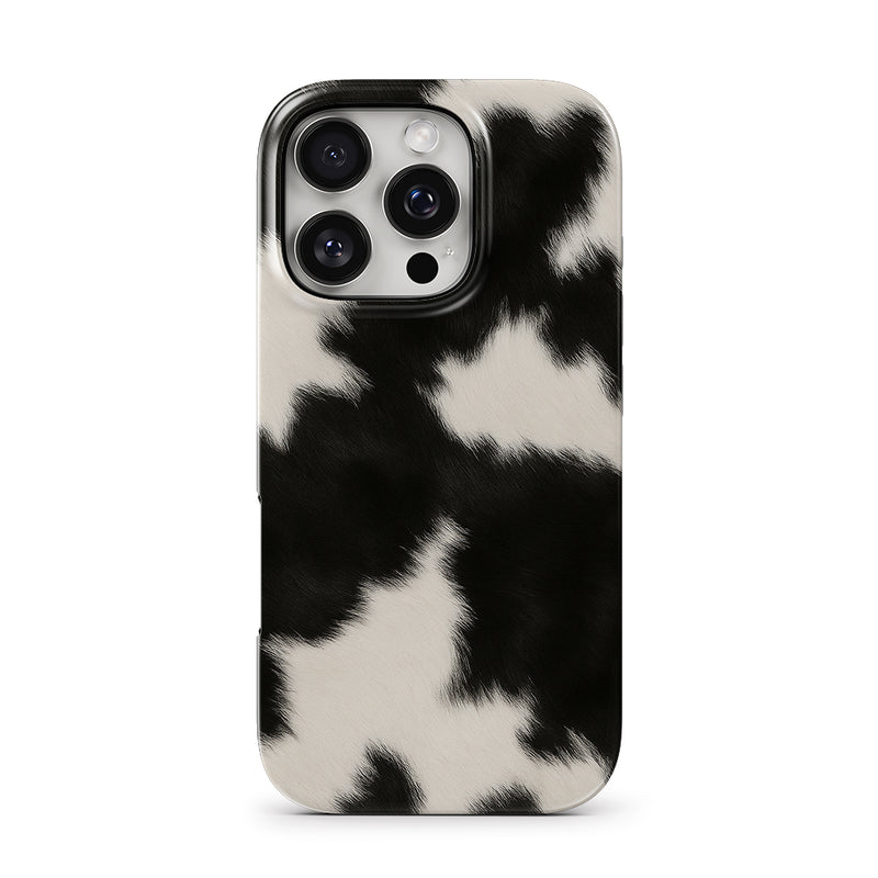 Trendy cow print iPhone case in black and white with a soft fur-look design. Durable, protective & stylish accessory for all iPhone models.