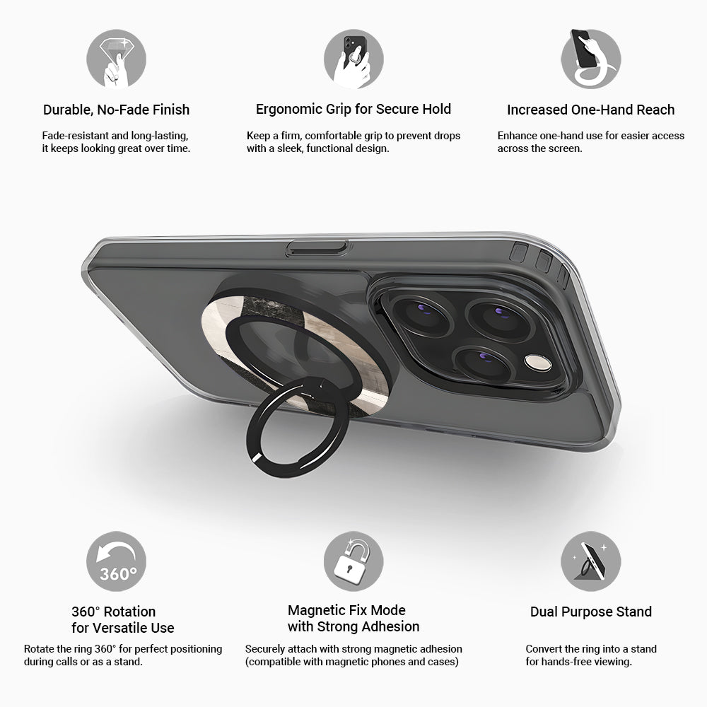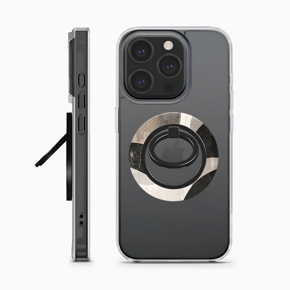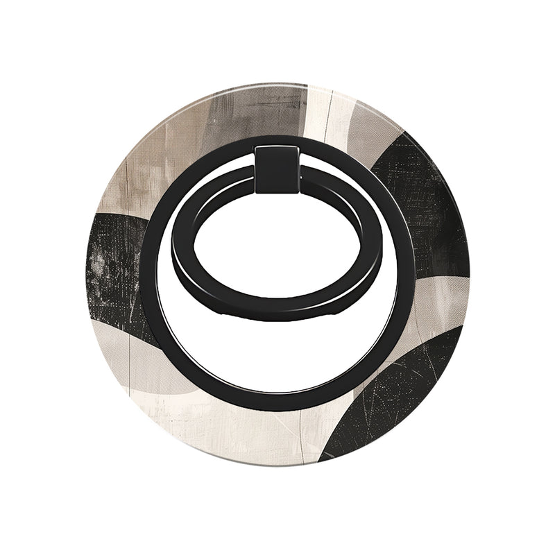 Stylish magnetic phone ring holder with a neutral abstract design in beige and black. Secure grip, MagSafe-compatible, and perfect for hands-free use.