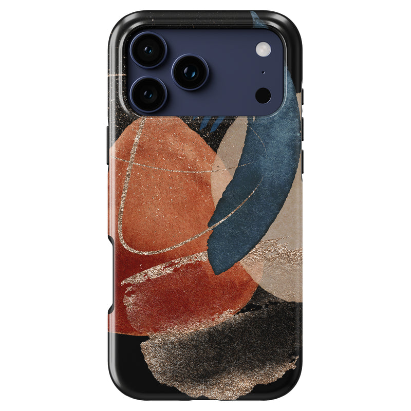 Moody and sophisticated - deep navy, rust, and champagne gold layered over black. It feels like abstract midnight energy - artistic, confident, and quietly luxurious.