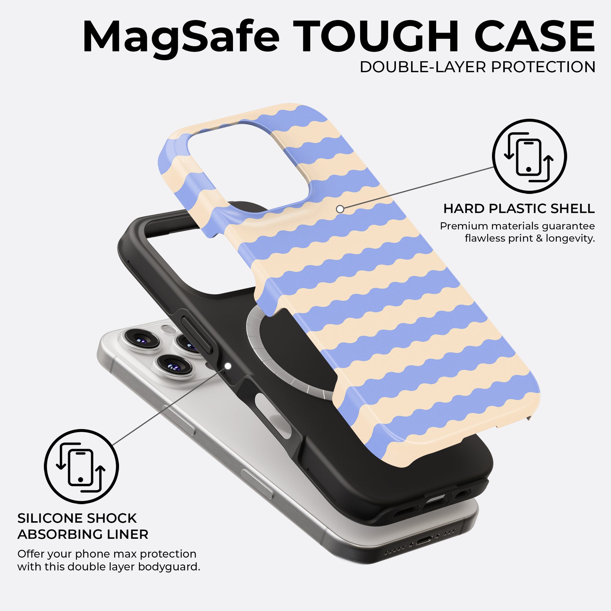 Playful pastel blue wavy stripe MagSafe iPhone case with soft beige tones. Compatible with wireless charging and perfect for aesthetic lovers.