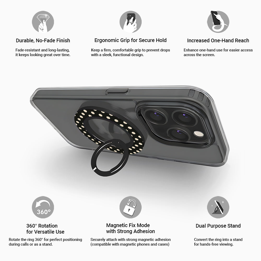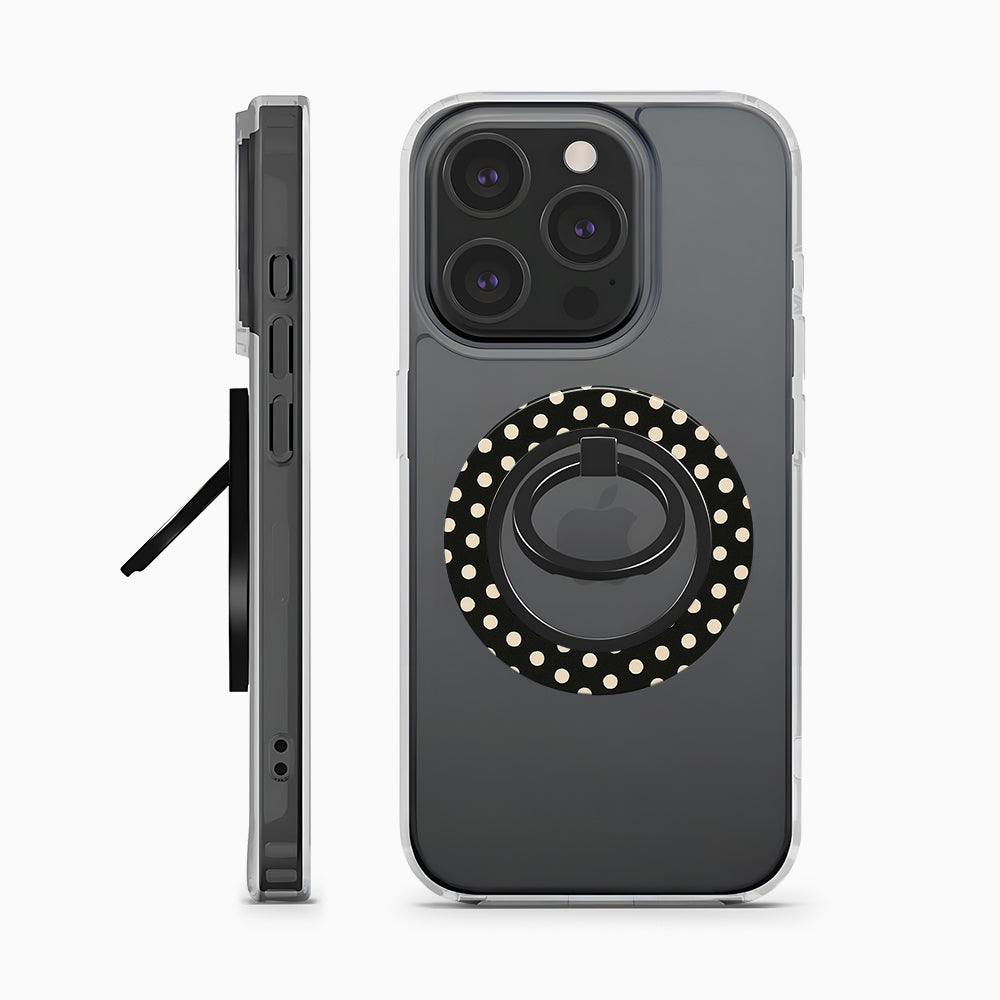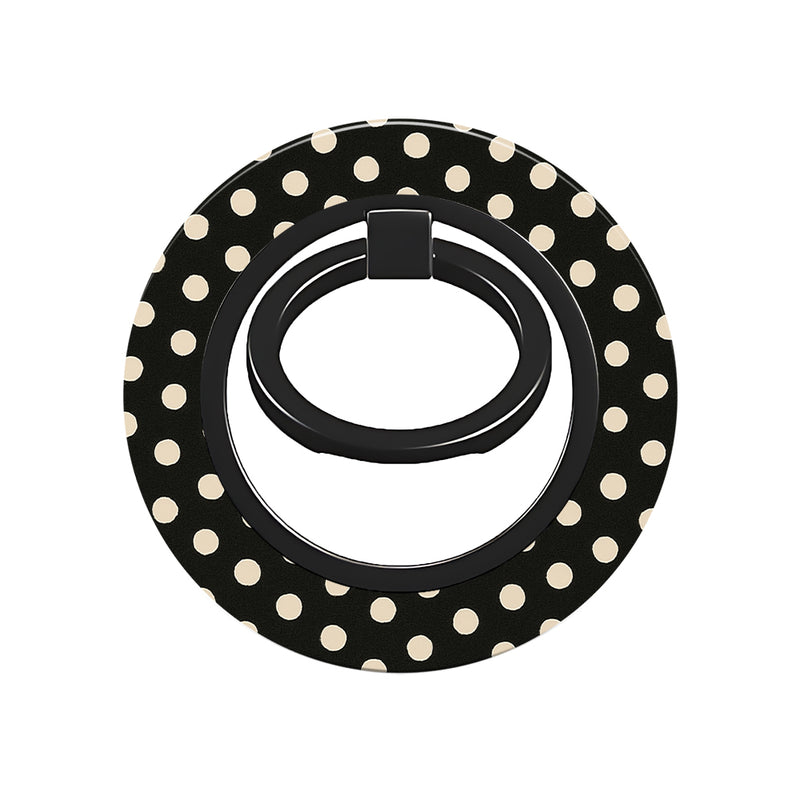 Upgrade your phone with this magnetic ring holder in a black polka dot design. Stylish grip and secure stand support for everyday use.