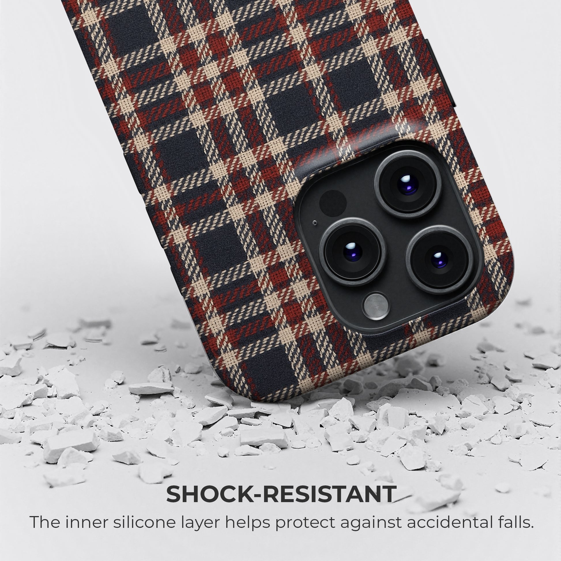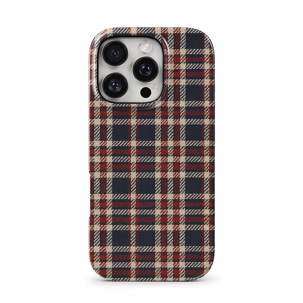 Retro tartan plaid iPhone case with red and navy check pattern. Stylish, durable, and perfect for cozy fall vibes or classic fashion lovers.